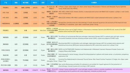 在胸腺上皮肿瘤、头颈鳞癌、肉瘤、前列腺癌、甲状腺癌等其他多个疾病领域,卡瑞利珠单抗、阿帕替尼、瑞维鲁胺、阿得贝利单抗、法米替尼、HRS-7058、HRS-4642等抗肿瘤创新药相关研究一共入选了4项口头报告、1项简短口头报告、4项壁报、1项电子壁报,彰显了918搏天堂强大的研发实力。此外,海曲泊帕和昂丹司琼口溶膜分别在防治化疗导致的血小板减少和恶心呕吐方面各有1项研究入选壁报。